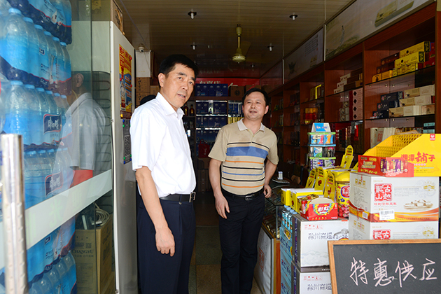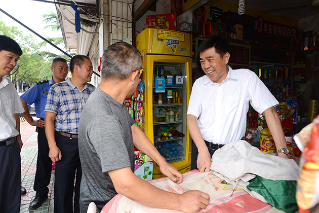 汪建中向沿路商家经营户宣传文明创建工作